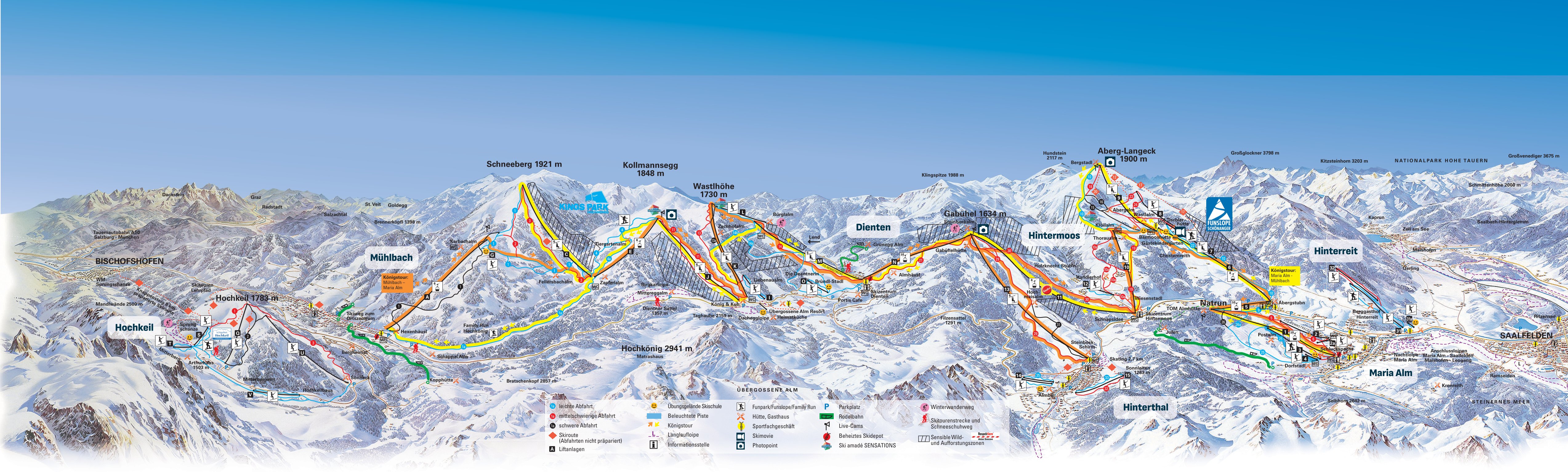 Vor der Kulisse des Hochkönigs laden weite Pisten und unzählige Skihütten zum Skifahren und Genießen ein. 34 Bahnen und Lifte verbinden mehrere Täler und Orte mit insgesamt 120 km Abfahrtspisten.